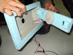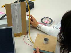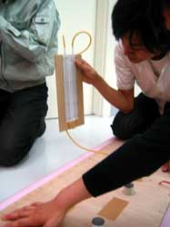 手作りした水柱式圧力計でファンの性能をテスト。 最適なファン形状を見つけ出す作業が続く…