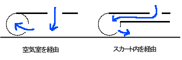 送風機から吸い込んだ空気の流れですが、左のように2通りの方法が考えられます。 今回は、過去の経験から空気の大部分はスカート内を経由して床面まで空気を導き、一部の空気は直接床面に導く構造としました。