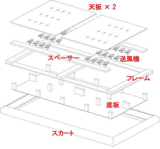 機体は木材で製作します。コストが安い、材料の加工が容易なことがその主な理由です。 機体は人が乗るスペースになること以外にも、送風機の固定、機体の上面から吸い込んだ空気を床面まで導くなどの幾つかの働きがあります。