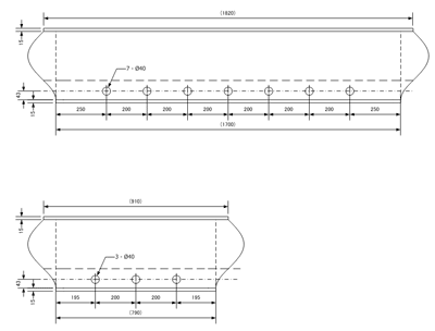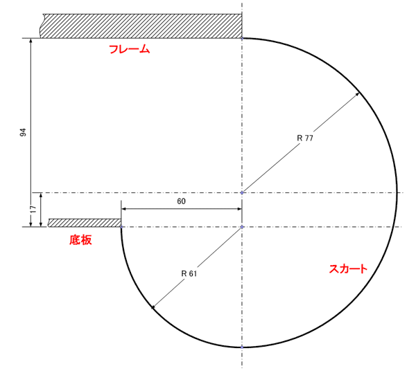 スカートの材料は、テーブルクロス用の表面に塩化ビニールが張ってある布を使う。 断面が左の図のように2種類の円弧になることを想定して、布地の裁断や縫製を行う。