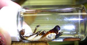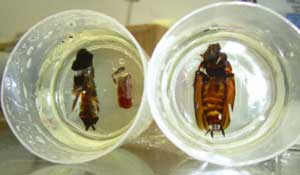 2.液体を体内にしみこませるためにゴキブリの一部を切断し、そのままホルマリンづけ。
