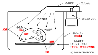 機器です。マイクロ波は、空気やガラス、紙などを通り抜け、金属には反射され、水に