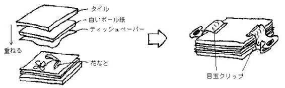 ッシュペーパーをかぶせ、ダンボール紙を置きタイルを重ねて両端を目玉クリップではさ