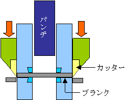 同時にブランクの外側を押さえ、中心部をプレスして浅い円柱(コップのような形)にします。この