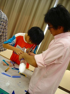 | 二十四日はロケット本体を作りました。 まず、ノーズコーンを作ります。材料には、発泡スチロールを用いました。 |