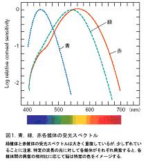 錘には 3 種類あり、S 錐体(Sort 錐体、青錐体)と M 錐体(Middle 錐体、緑錐体)と L 錐体(Long 錐体、赤錐体)に分類される。