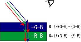 次に G フィルタである。ここでは、 RB の光が吸収され、G のみが透過できる。最後の B フィルタでは RG の光が吸収され、B のみが透過できる。