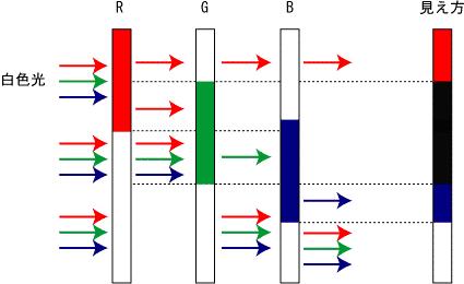 こうして 3 つのフィルタを通して生き残った光が、色の原因になる。図 1.4. では、一番上の部分は赤が生き残るから赤く見えるが、その下部分は RGB の光すべてが吸収されてしまうために黒くなる。逆に、一番下の部分はRGBすべてが生き残るため白色になる。