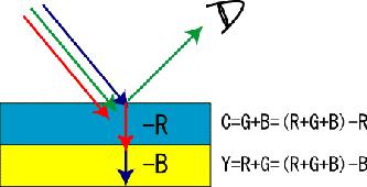 まず、入射光は白色光だから RGB の重ねあわせである。ここで C の層は図 2.2. の上の式から、R の光を吸収する効果があることがわかる 。同様に Y の層では B の光が吸収される。したがって、反射して目に入ってくる光は G のみとなる。