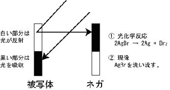 まず、臭化銀 (AgBr) を透明な膜に塗布したネガフィルムを用意する。被写体の白い部分に光が当たると、その反射光がネガに当たり、光化学反応で臭化銀を銀に還元させる。このとき、銀の部分は黒くなる。一方、黒い部分は光を吸収するから、ネガ上の臭化銀はそのまま残る。
