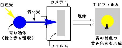 次に、ネガを焼き付ける過程の説明をします。先ほどのように青い物体を被写体に選ぶと、 Y の色素を持つネガが生成します。このネガに白色光を通すと、Y (= R + G) の光はネガを透過しますが、 B の光は吸収されてネガを透過しません。透過した RG の光でもう 1 回ネガの生成と同じ操作を行うと (但し今度はフィルムではなく印画紙を用いる)、R からは C の色素が、G からは M の色素が生成します。 減法混色により、G + M = B だから、この印画紙の上には元の被写体と同じ B の画像が生成します。