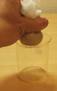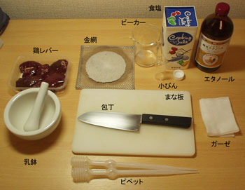材料鶏レバー、食塩、エタノール(できるだけ高濃度のもの)、ガーゼ 器具包丁、まな板、乳鉢、ビーカー、金網、小びん、ピペット、ガラス棒など ビーカーの代わりに鍋、乳鉢の代わりにすり鉢で代用できるので、家庭でも簡単に実験することができます。無水エタノールは、薬局で 500 ml で 1000 円程度でどなたでも購入できます。 レバーを刻む