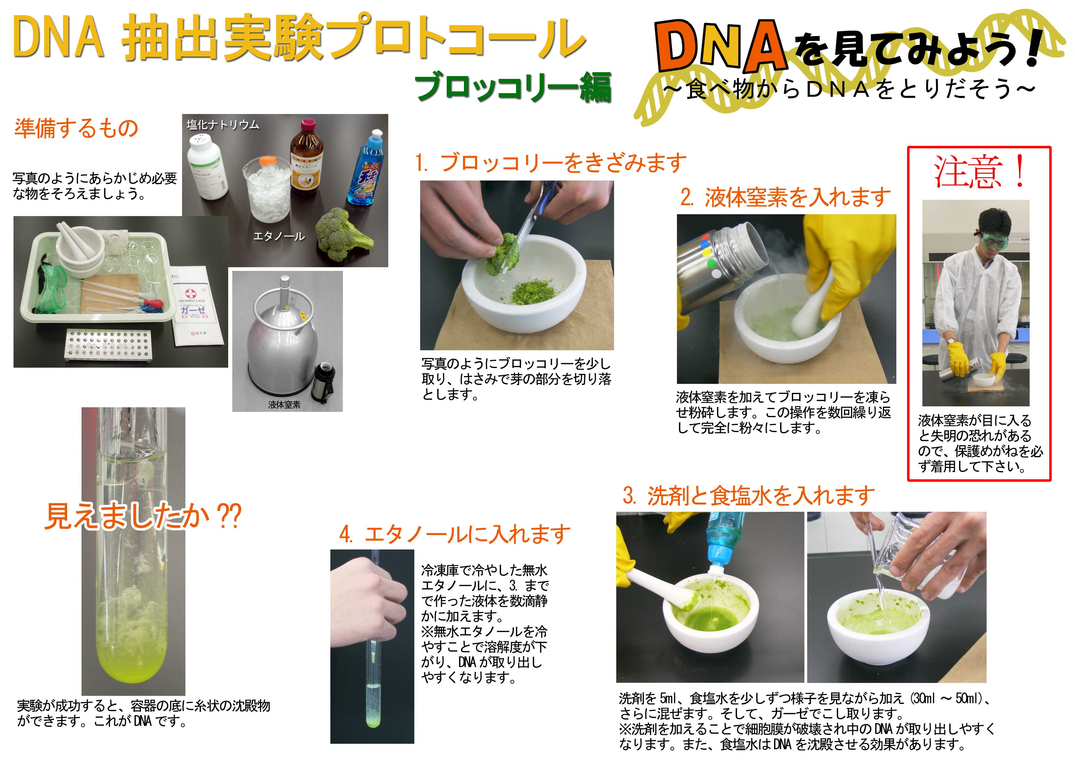 ブロッコリーから DNA を取り出そう!準備材料・器具を準備します。 飽和食塩水を作ります。熱湯に食塩を可能なだけ溶かし、冷ました後、ろ過しておきます。 飽和食塩水とエタノールは、冷凍庫で冷やしておきます。 材料ブロッコリー、食塩、洗剤(食器用で可)、エタノール(できるだけ高濃度のもの)、ガーゼ、ろ紙 器具包丁、まな板、乳鉢、ビーカー、ろうと、試験管、ピペット、ガラス棒など ※ろうととろ紙は飽和食塩水を作るときに使います。無ければ、コーヒー用のものでも可。 ブロッコリーの芽の部分を切り落とし集めます。