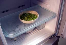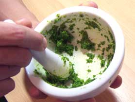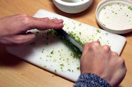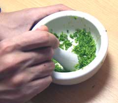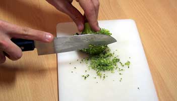 凍らせたブロッコリーの芽を包丁で細かく刻みます。
