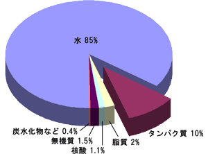 DNA は何をしてるの?生物は何でできているの?生物の身体を形作っているもののうち、水を除くと 3 分の 2 はタンパク質 生物が生きるためには…生物の身体を形作る細胞は、日々新しいものに生まれ変わっています。つまり、常に生物は自分の身体を作り続けているのです。 この新しく作られる身体の材料を得るために、生物の一種である私たちヒトは食べ物を食べます。 そして私たちが食べた物は、胃や腸の中に入り、食べた物を身体の中に取り込めるようにするためと、 身体の中に取り込んだ後で身体を作る材料として使えるような形に加工されます。 この働きは「酵素」という物が、胃や腸から出されることによって起こります。 私たちが生きるためには、休むことなく息をして酸素を取り込まないといけません。 実は、このときの肺の中でも「酵素」という物が働いているのです。また、血液を体中に動かすために心臓を常に動かしています。 また、歩いたり、ものを考えたり、身体は常にエネルギーを使っています。そのために、身体は常にエネルギーを作り出しています。 実はこのエネルギーを作る時にも「酵素」というものが必要なのです。 酵素って何?酵素は、身体の中でおこる様々な現象にかかわる重要な物質です。 このほとんどが、タンパク質からできています。 人間の身体の中には数万種類の「酵素」があって、日々活動しているのです。 DNA のもう一つの働きDNA は、身体を作る設計図という役割以外にも、酵素を作るレシピという重要な役割があります。 さらに「どのような場合にどの酵素が必要になる」といったことまで、書かれているのです。 言ってみれば、生物の生涯のシナリオかもしれませんね。 最新の研究では、人間の心もこの酵素というタンパク質が支配しているかもしれないという仮説もあり 日々研究が進められています。子供が将来どんな大人になるか、どんな性格の人になるのか、最期はどんな病気で死ぬのか? こんなことは生まれ持ったDNAで決まっているのか? などという夢や希望を壊すような問題の答えは 科学技術の進歩した今でも良く分かっていません。 |