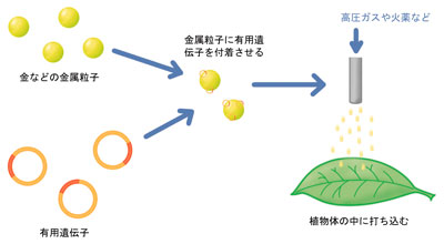 金やタングステンなどの重たい金属の微粒子に有用遺伝子を組み込んだプラスミドを付着させ、 高圧ガスや火薬などを使って目的の植物体の中に打ち込む