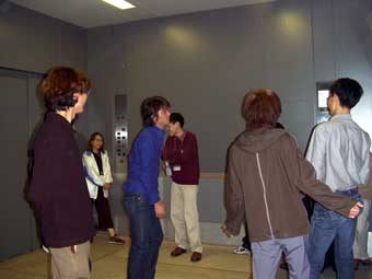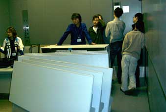 巨大エレベーターで机を輸送中。7F に着くまでかなり時間がかかる