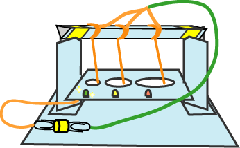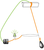 さて、今回はスイッチをつけない代わりに、左のリングと導線がスイッチの役割をします。地震の勢いで振り子がリングに 当たると、電気が流れてライトが点灯します。小さな地震のときは振り子があまり振れないので、振り子とリングが 接触することはありません。つまり、このときはライトが点灯しません。