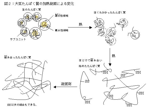 こうした現象が起こる理由を上図に基づいて説明します。加熱前にはたんぱく質中の各サブユニットには外側に 親水性領域(水に溶けやすい領域)、内側に疎水性領域(水に溶けにくい領域)があります。 加熱すると 80 - 90 ℃ぐらいから糸玉状のサブユニットはほぐれ始め、内部にある反応しやすい部分が外側に出てきます。 ほぐれた糸は互いに絡みやすくなりますが、なかでもたんぱく質中の一部の SH 基と呼ばれる部分が近くの分子の SH 基と 反応して結合し、各々の糸(サブユニット)の間に S-S 結合と呼ばれる結合を作り絡み合います。互いに絡み合った糸玉は 大きなかたまりとなり、親水性を失って沈殿しやすくなって、凝固剤を加えると容易にゲル(ゼリーやスライムのような 半固体状の物体)となり、沈殿します。加熱温度が足りないと糸玉は十分にほぐれずに絡み合いがうまくいかず、 また加熱しすぎると結合が堅くなり、ゲルはできなくなります。さらに過熱し過ぎや高温での放置では SH 基が反応性を失い ちょうど良いゲルができなくなります。